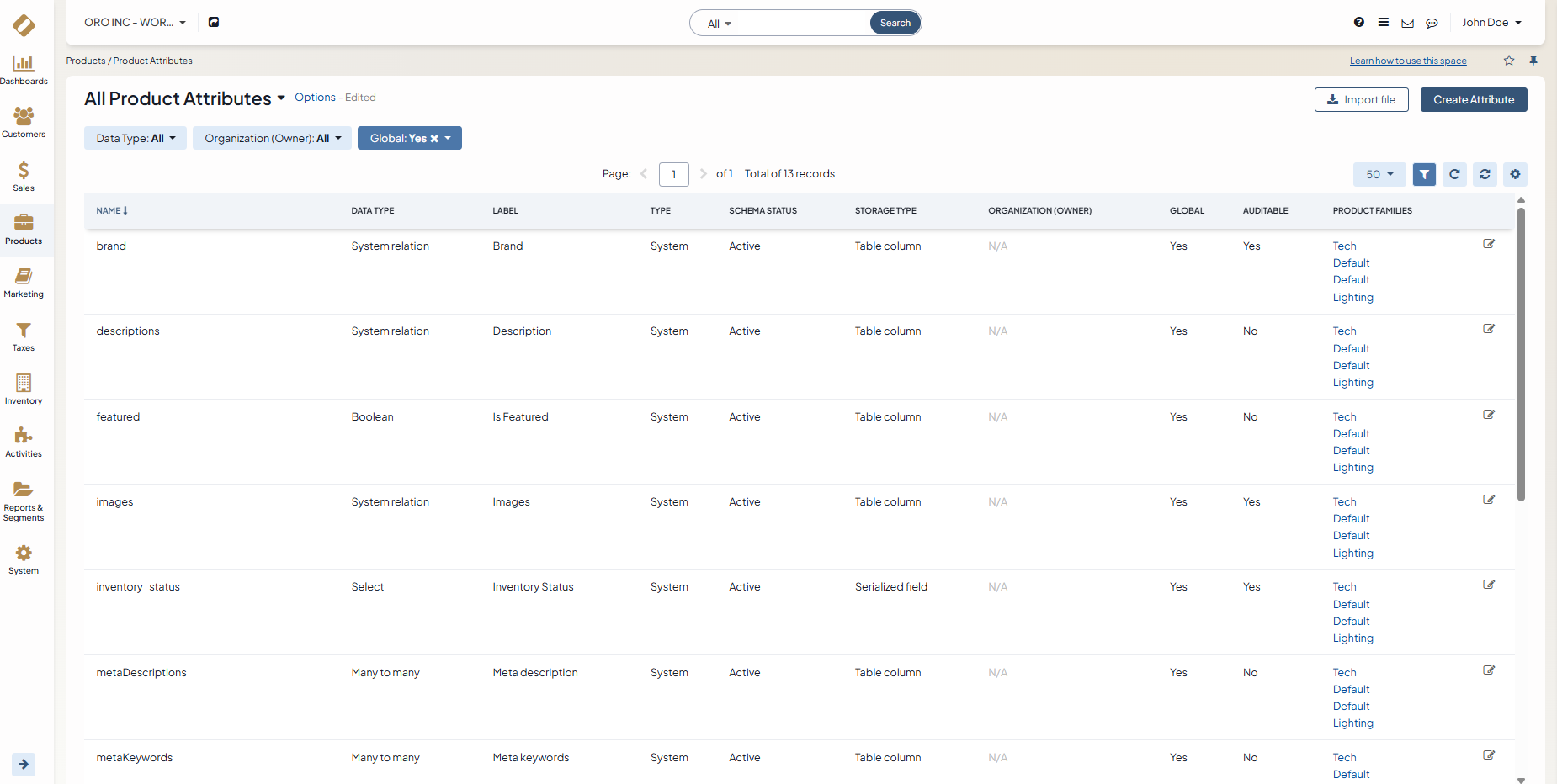 Product attributes in OroCommerce fall into two categories: custom attributes, which you create yourself, and system (global) attributes, which are provided out-of-the box. System attributes are shared across all product families and cannot be removed. However, you can reorganize how they are grouped within a family. By default, OroCommerce includes the following system product attributes: