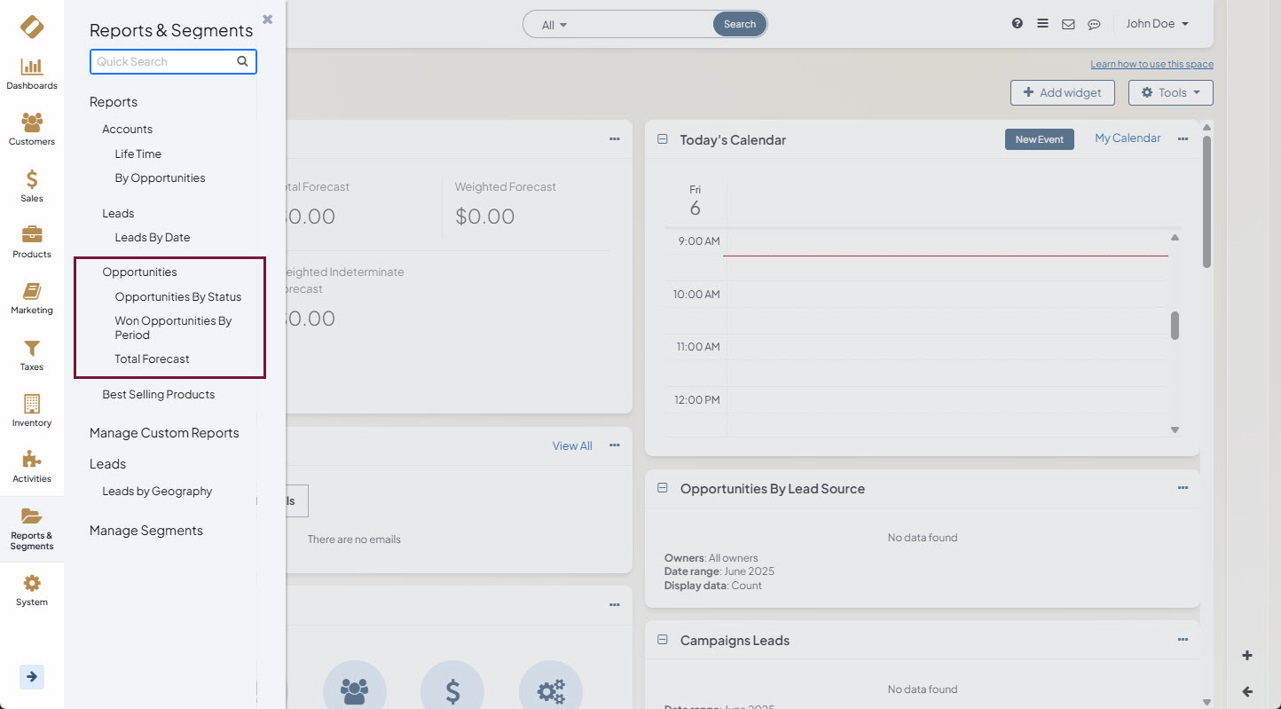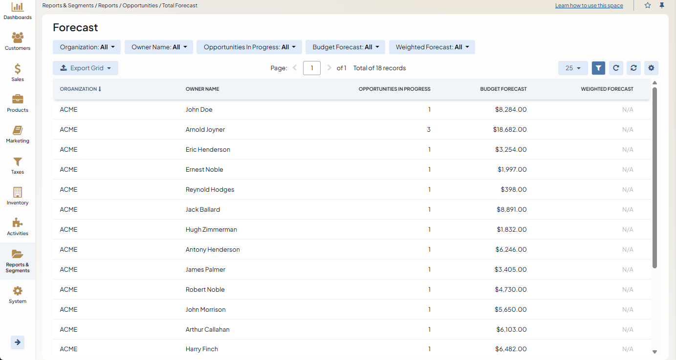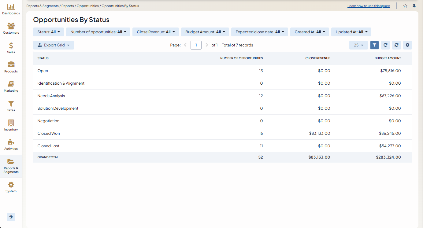 Opportunities by Status is a report that allows you to see how many opportunities with a specific status are available in the system, what their total close revenue and budget amount are.