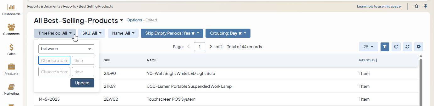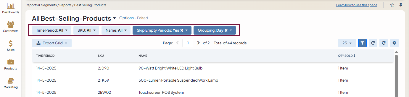 To filter the output of a Best Selling Products report: