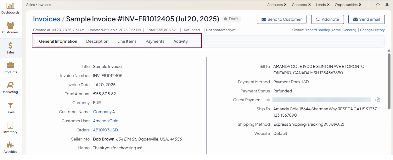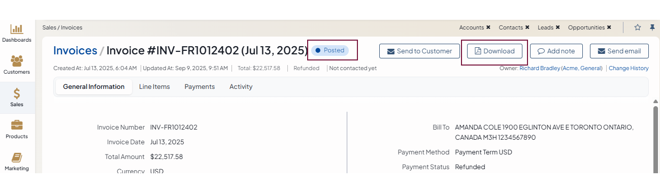 Download the invoice (available as of OroCommerce v.6.1.5) — You can download only the invoices in the Posted status. To post the invoice, click the Send to Customer button and refresh the page. To download the generated invoice as a .pdf file, click Download. Once created, the PDF will not be re-created, even if the invoice is modified later.