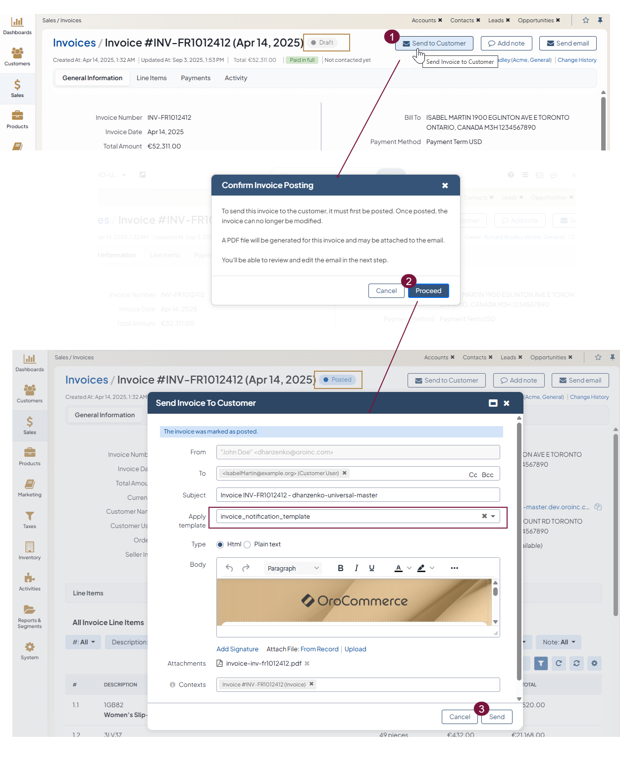 Send the invoice to the customer (available as of OroCommerce v.6.1.5) — To send the invoice to the customer, the invoice must first be posted. Click Send to Customer to open the posting confirmation dialog. Keep in mind that once posted, the invoice can no longer be modified. Click Proceed to post the invoice and open the email popup dialog with the predefined details of the invoice. The dialog uses the invoice_notification_template email template, which you can customize as needed, following the email templates documentation.