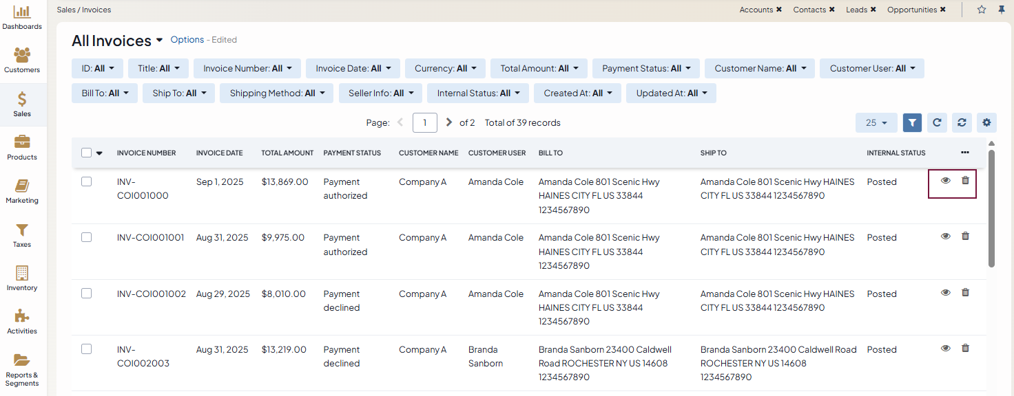 In the invoices grid, you can open an invoice to view it, or delete it.