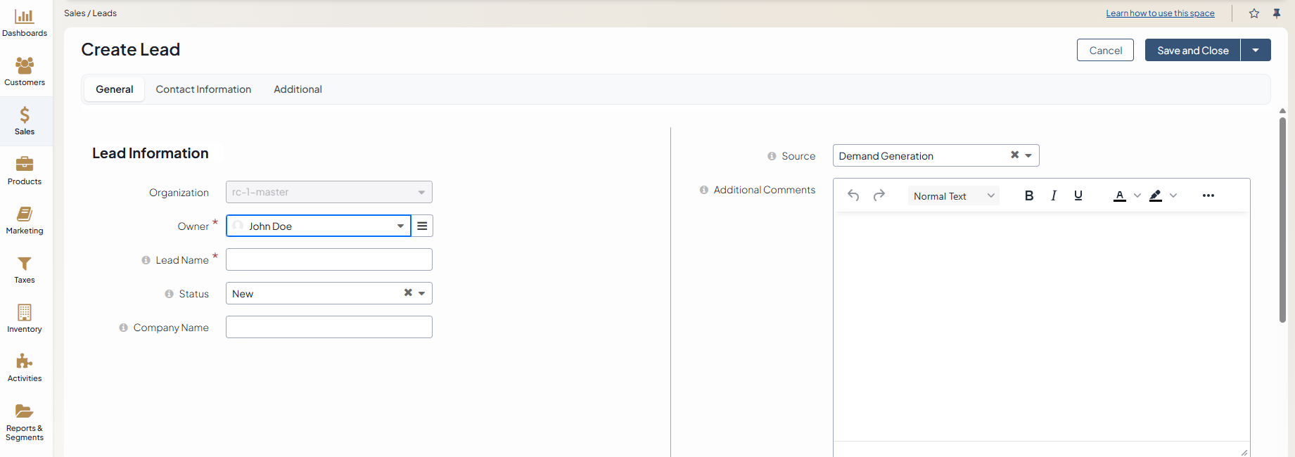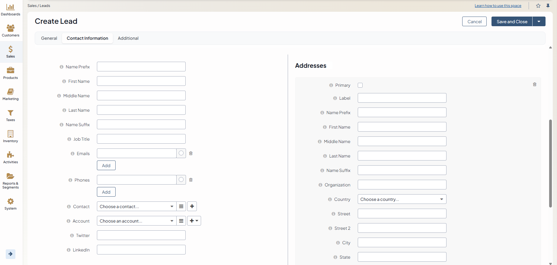 In the Contact Information section, provide contact details to be entered for a lead. You can enter multiple emails, phones, and addresses for a lead.
