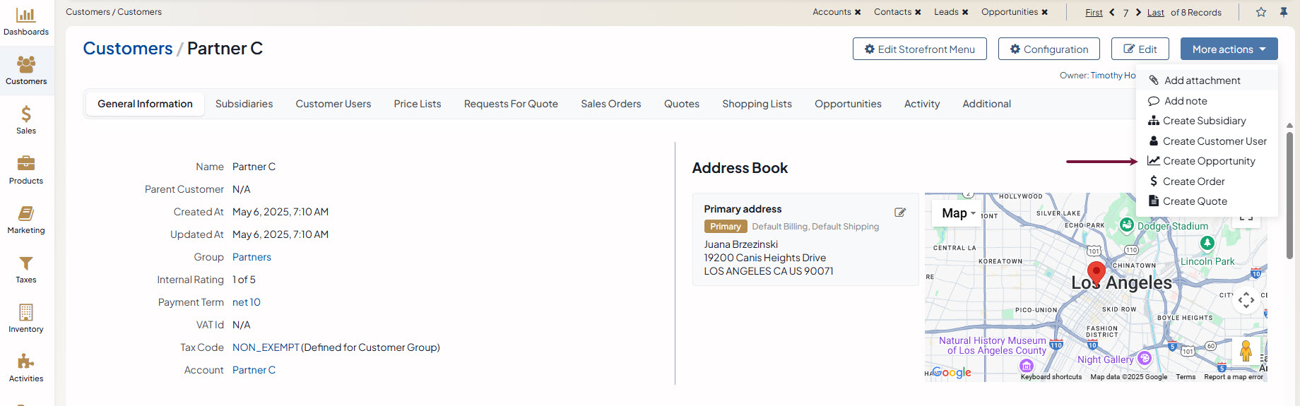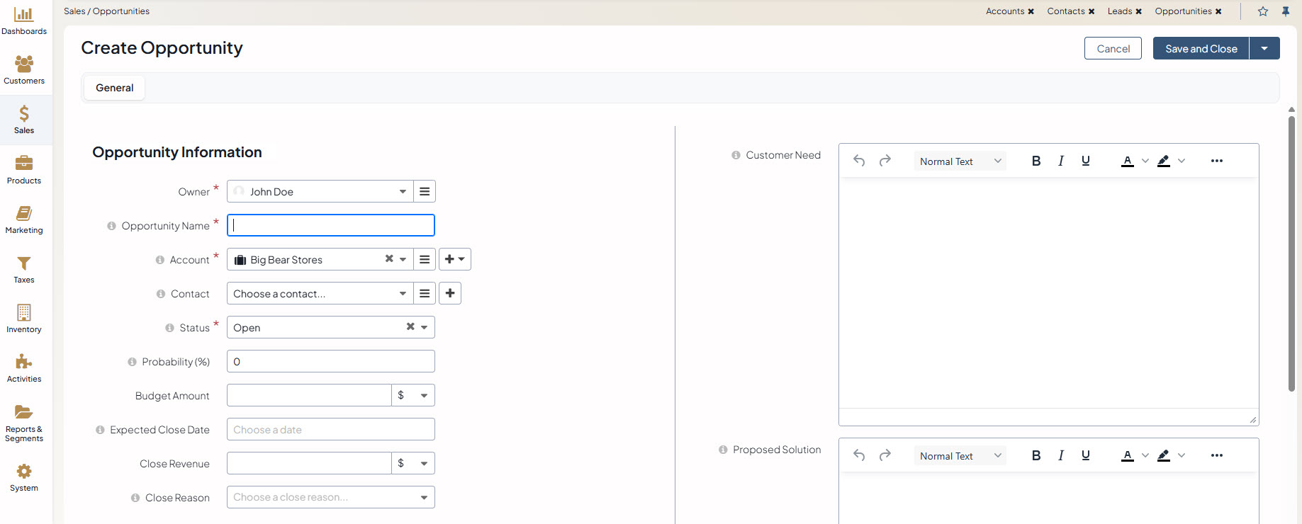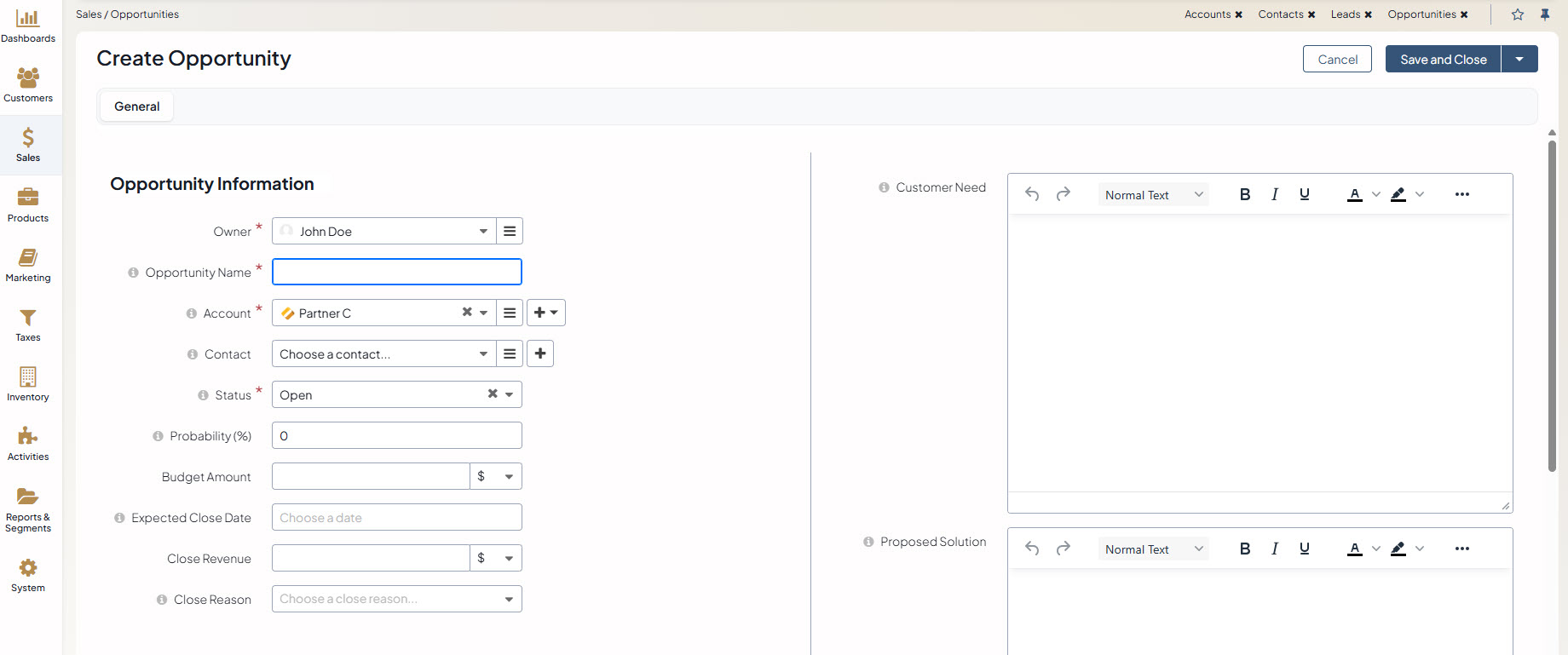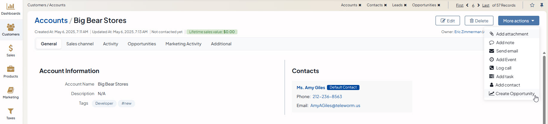 Opportunities can be related to any customer type and customers introduced by various third-party extensions. They can also be related directly to accounts. This is the most straightforward application setup if you do not need to track multi-channel sales. You can always enable the additional complexity of multiple customer channels when the need arises. You can create opportunities from all related entities (e.g., from OroCommerce customer, account), by converting a lead to an opportunity and by creating an opportunity manually.
