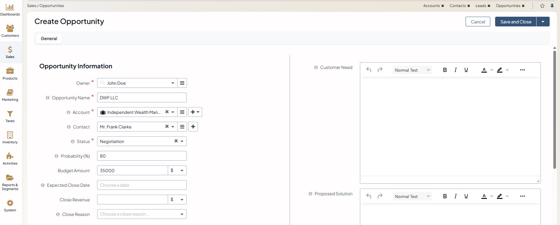 Budget Amount — A budget amount is the discussed potential deal value. For the Oro application Enterprise Edition, you can select the currency of the deal. The currencies available in the dropdown will depend on your system configuration. You can find more on multi-currency functionality further below this guide.