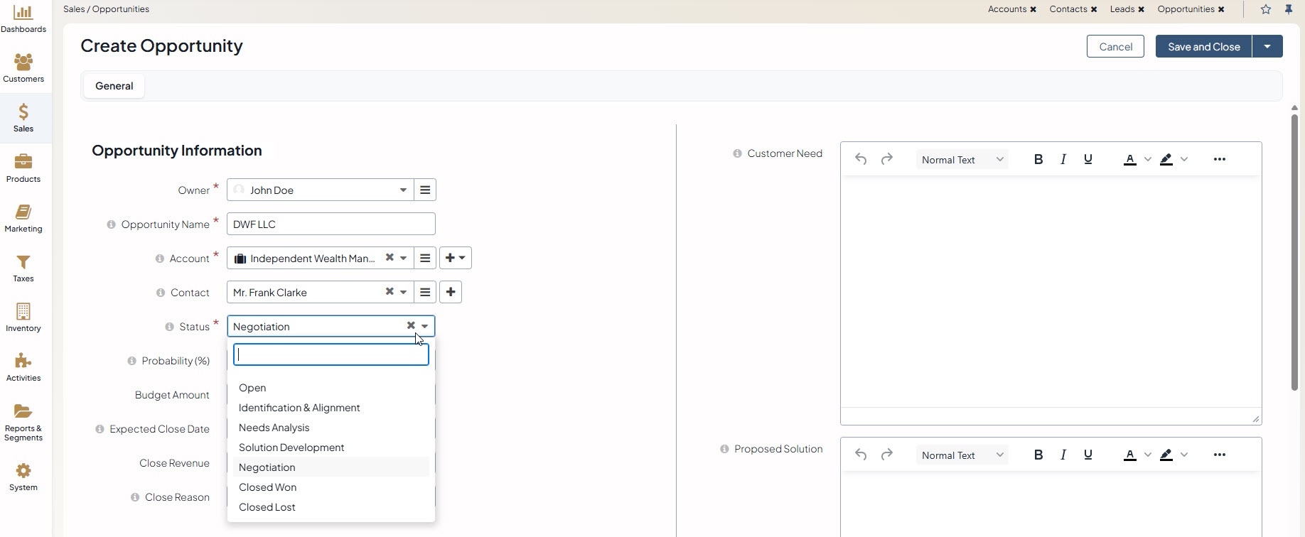 Probability — The perceived probability of an opportunity being successfully closed. Probability is related to Status. For each status, a certain percentage of probability is pre-configured automatically. You can configure percentage for each status in the system configuration.