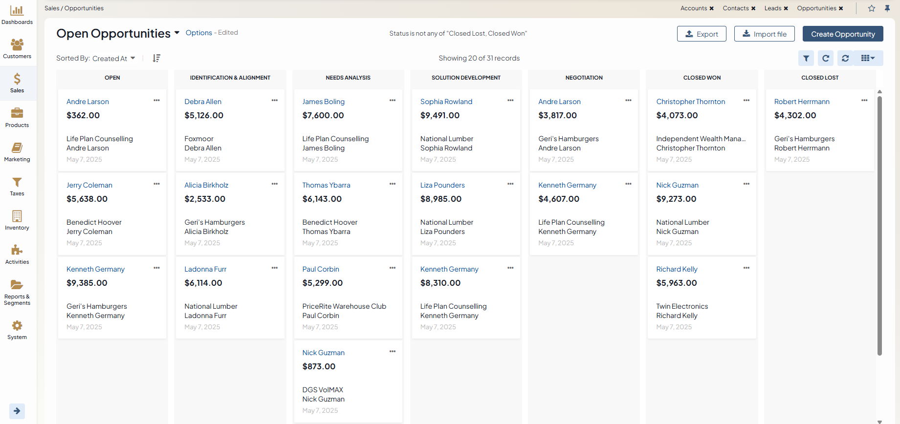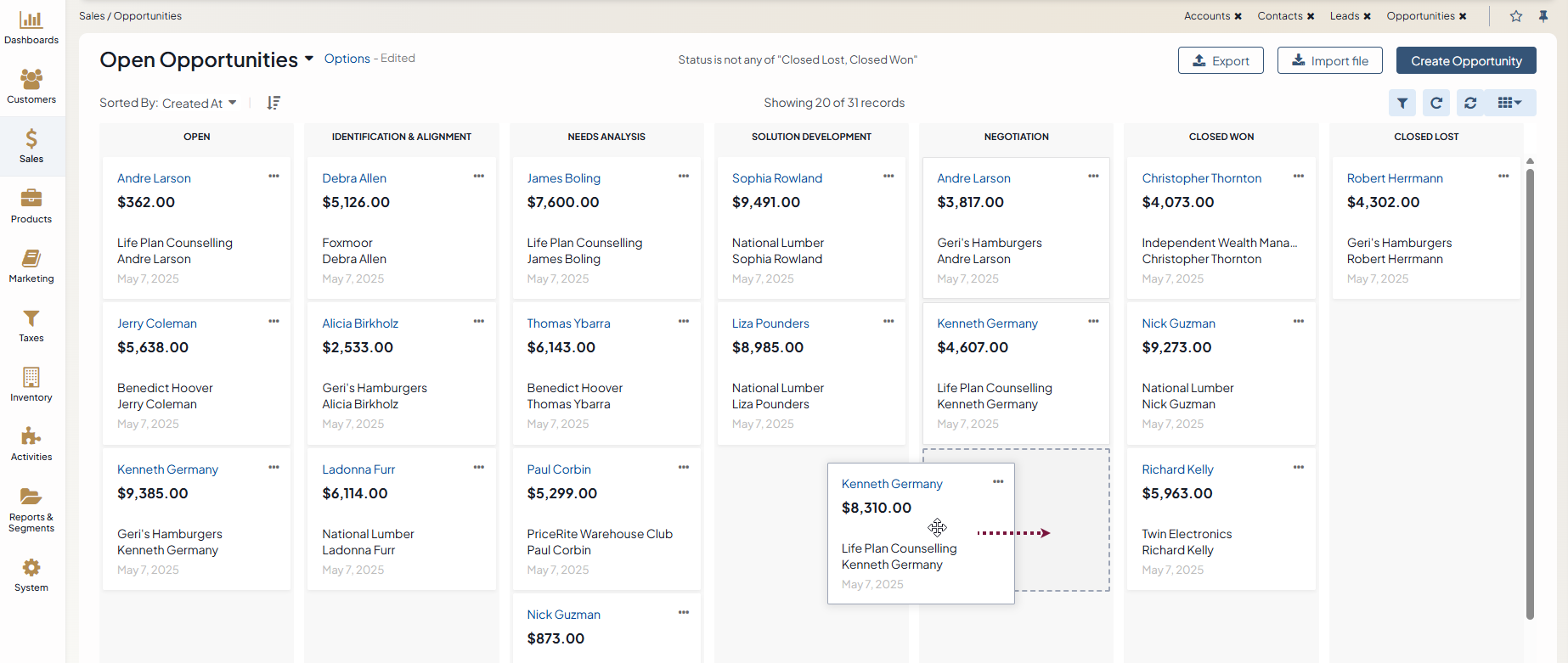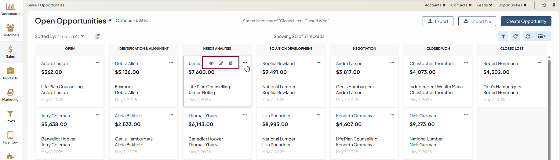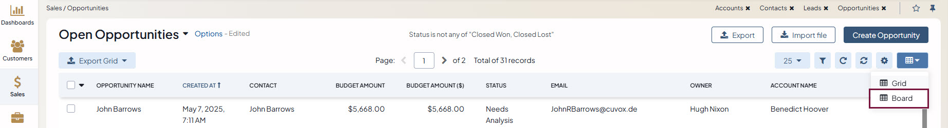 As an alternative to grid view, you can view Opportunities in Kanban board. To change grid view to board view, open Grid/Board menu and click Board.