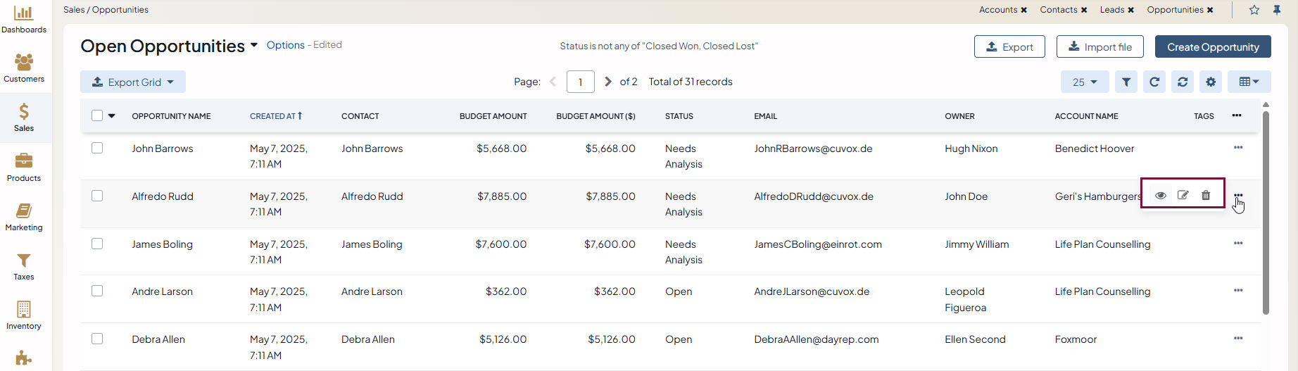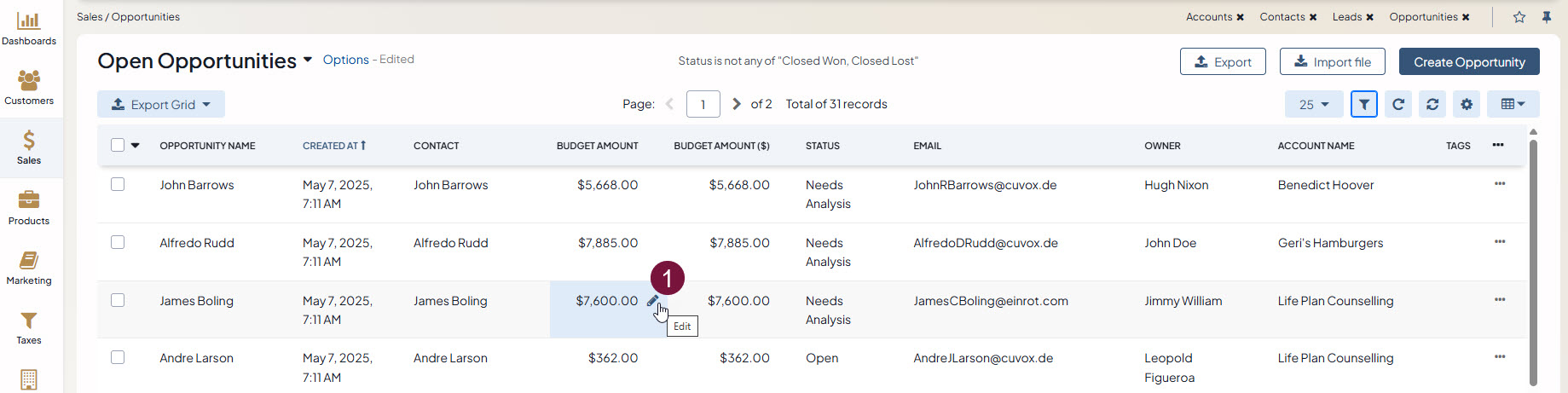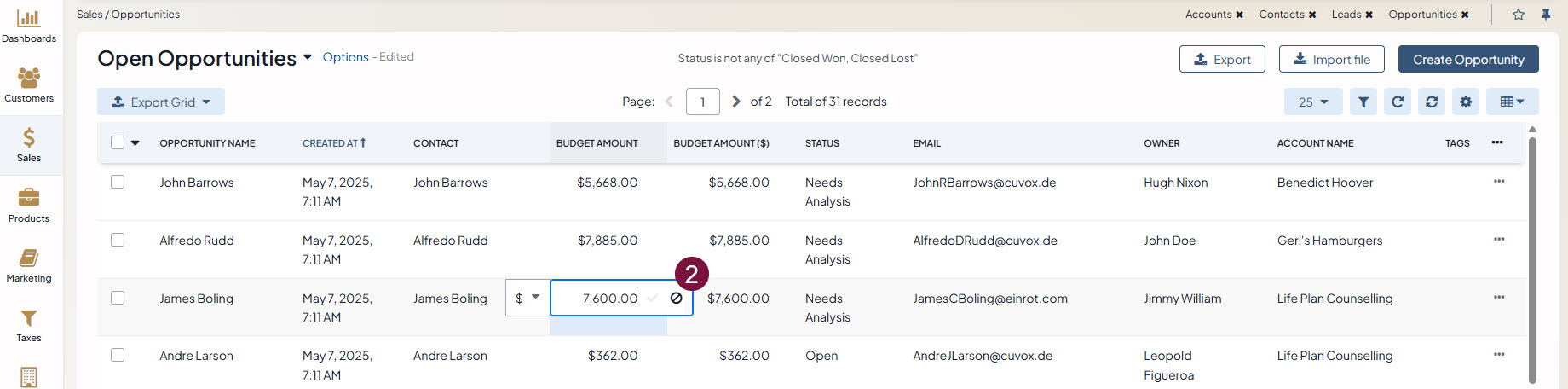 Inline editing can help you amend opportunity details without opening the edit opportunity form. For opportunities, it is available from records’ grids and view pages.
