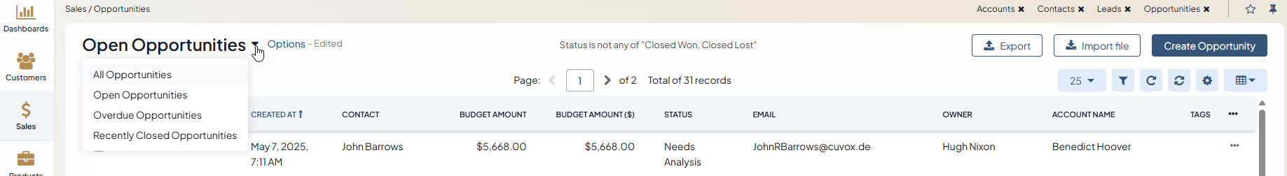 To change the grid view, click on the arrow icon on the right of Open Opportunities header and select the preferred grid view from the dropdown, as shown in the screenshot below.