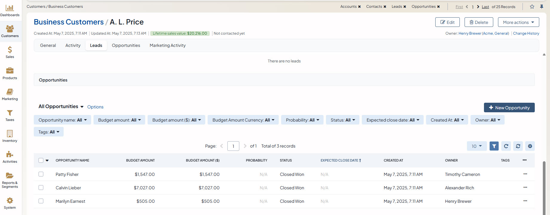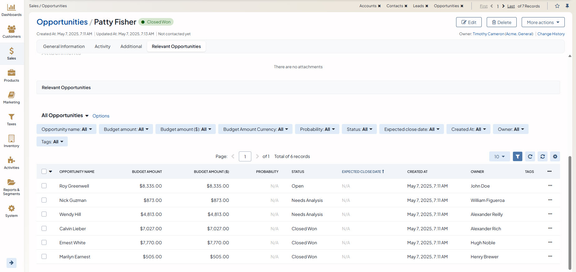 Customer, Account, and Opportunity view pages contain a list of relevant opportunities, so the complete history of the deals with a particular customer or account can be viewed in one place, thus helping the sales representatives find clues for the current deals.