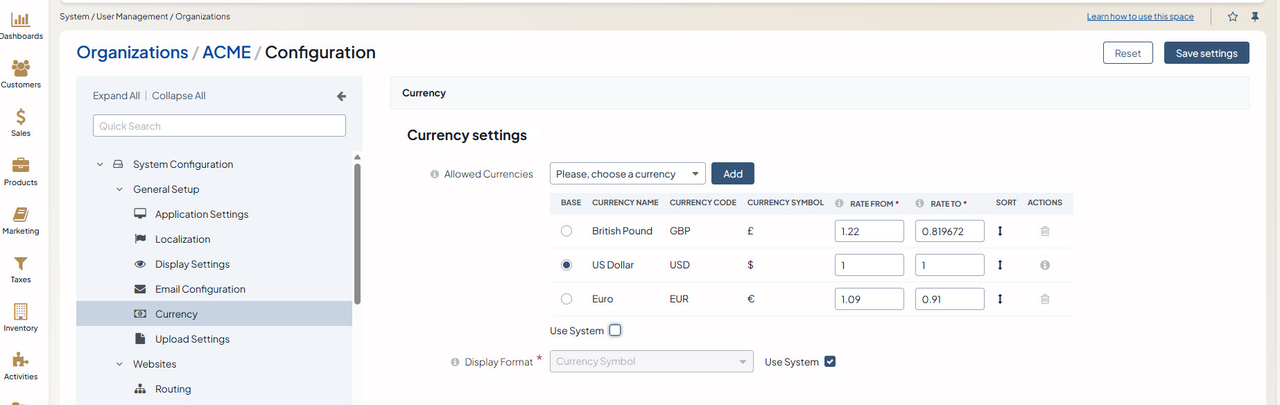 Unlock the currency grid by clearing the Use System checkbox.