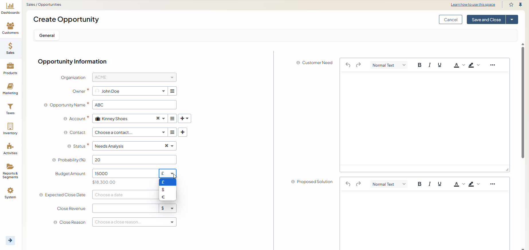 You can select one of the enabled currencies in the currency selector for the Budget Amount field. They are represented by a currency symbol, as configured in the settings. You can also specify the Close Revenue and the Budget Amount in different currencies.