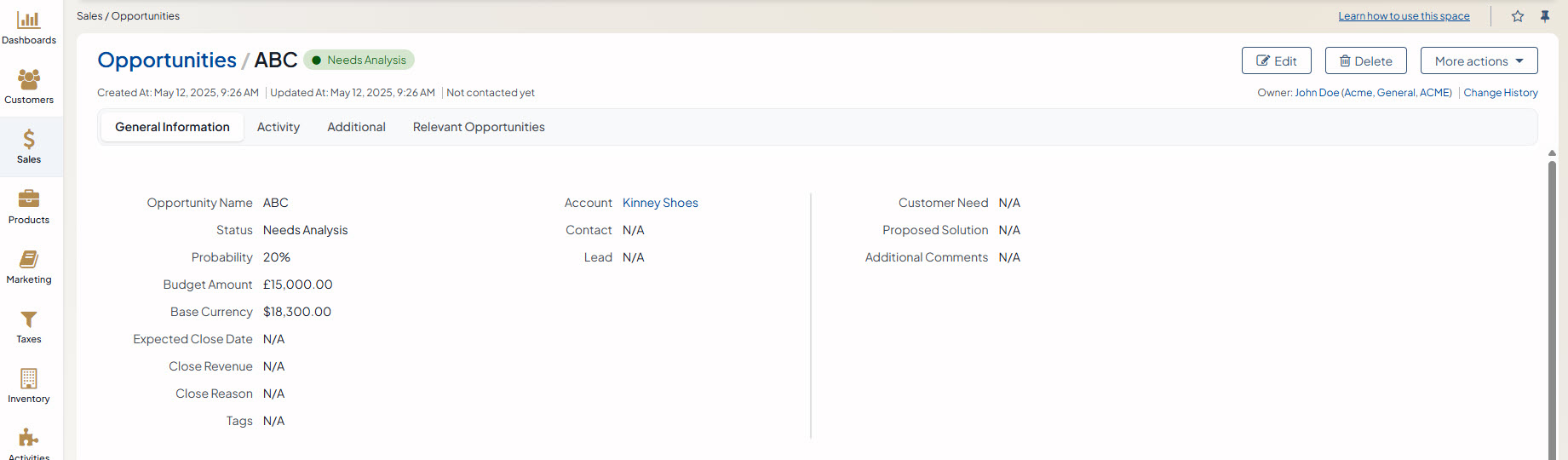 As you can see from the screenshot, the budget amount entered in British Pounds (£15000) has been recalculated to the base currency ($18,300) according to the exchange rate defined in the system currency configuration earlier.