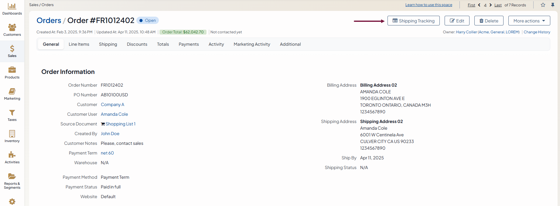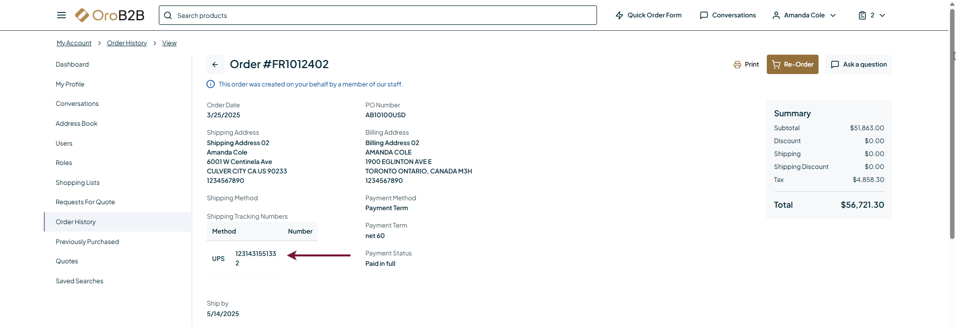 When a customer user submits an order, they provide the shipping address and, optionally, the Do Not Ship Later Than date. They may see the shipping cost estimate based on this information and their selected shipping method. After a salesperson adds the shipping service and their tracking number to the order, the customer user can track the delivery (if the shipping company provides this option).