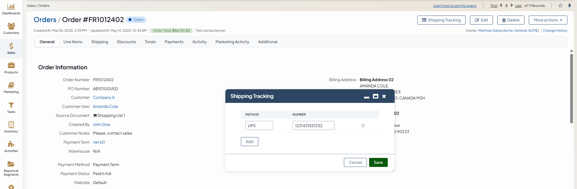To provide tracking details for additional shipping, click +Add and enter the method and tracking number.