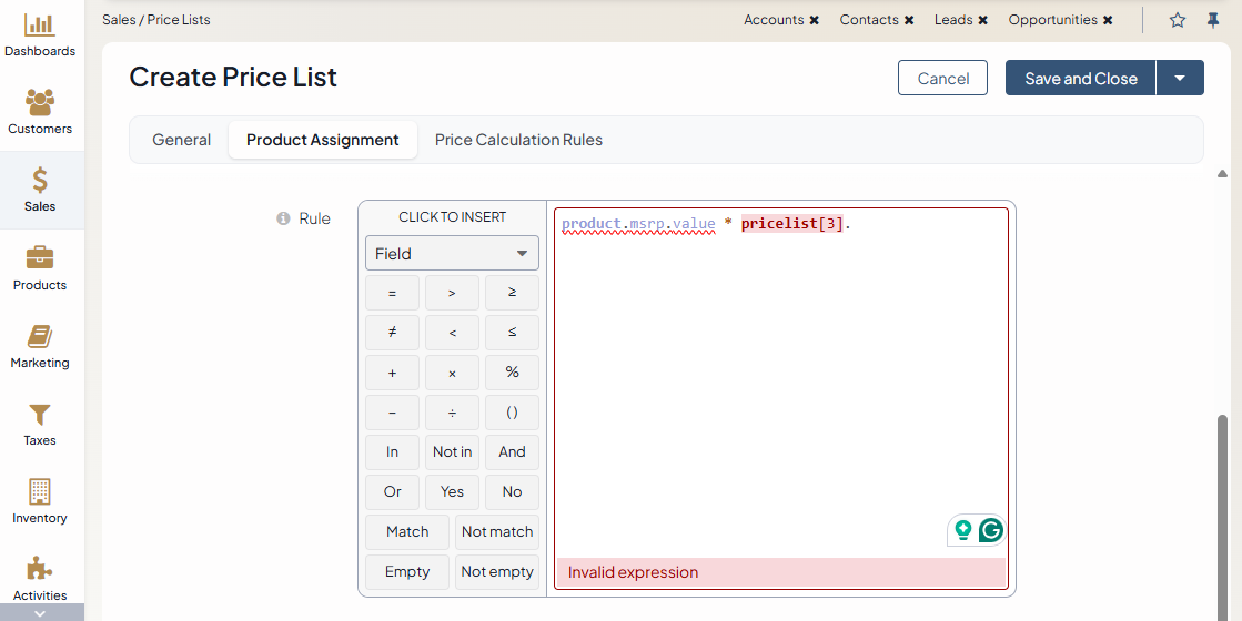 In the Product Assignment section, you can configure which products will be included in the generated price list. You can either select specific products or the entire product categories. To complete this, in the Rule field, insert criteria into the text area to filter products in the catalog with the Symfony2 expression language and the operators from the left. The system validates the expression syntax to make sure it is error-free (as illustrated in the screenshot below). To view available properties used in filtering expressions, see the Filtering Expression Syntax topic below.
