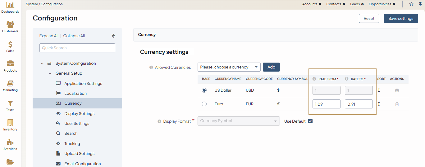 To simplify price management in multiple currencies, price calculation rules can directly use the currency conversion rates defined in the system configuration. However, currency rates are not updated automatically. If you need to recalculate prices due to a change in exchange rates, you must manually update the currency conversion rate in the system configuration. This update will trigger a full recalculation of all price lists that depend on that currency.