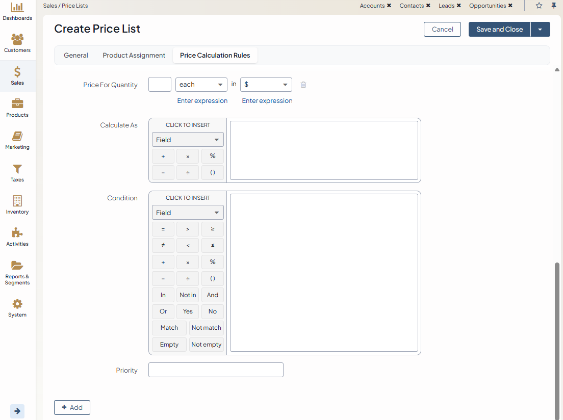 If you need to set up prices for another range of products selected into the price list or for another currency/unit, click +Add and repeat steps 1-4.