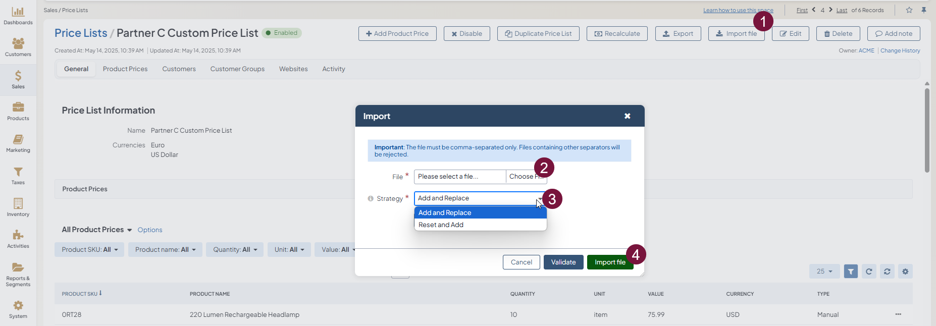 Import File option helps import a large bulk of product prices into the price list using the .csv file.