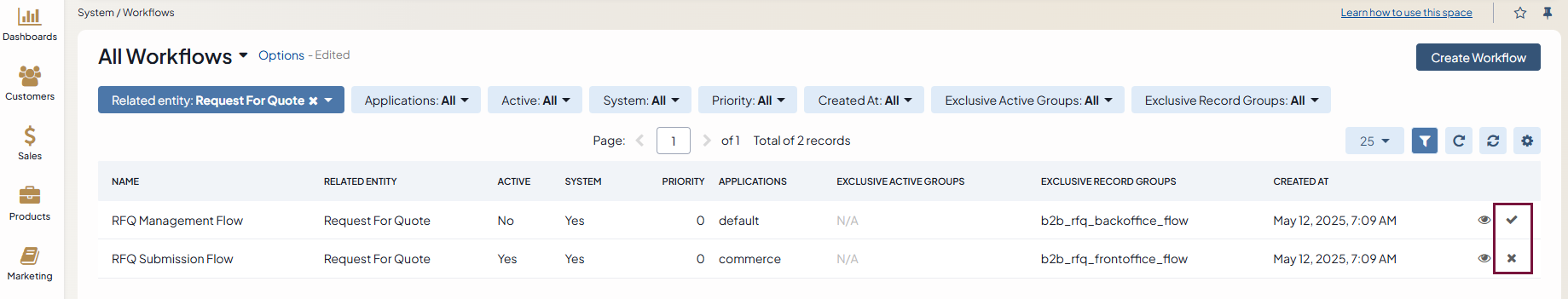 Configured RFQ-related workflows — activate or deactivate the RFQ workflows that control the interactions between the storefront and the back-office. These workflows help buyers, and sales managers run the process automatically and provide the corresponding status upon this interaction.