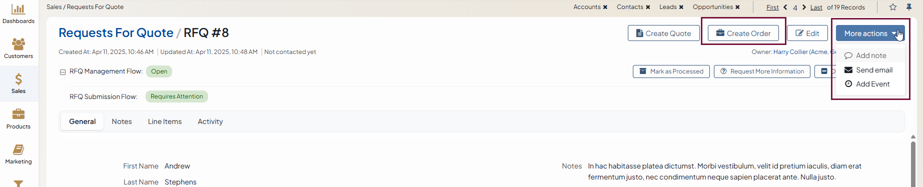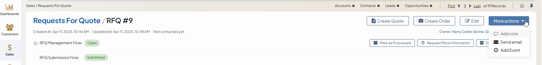 You can also engage RFQs in various activities, such as adding a note, sending an email or adding an event to an RFQ.