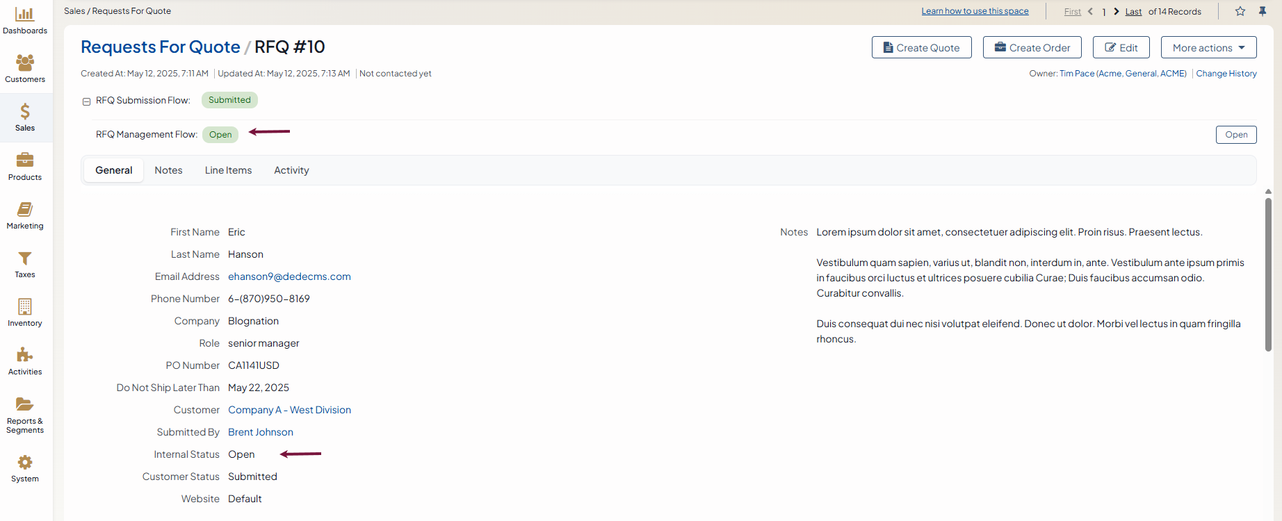 Once a customer submits the RFQ in the storefront, it becomes immediately available in the RFQ back-office in the Open status.