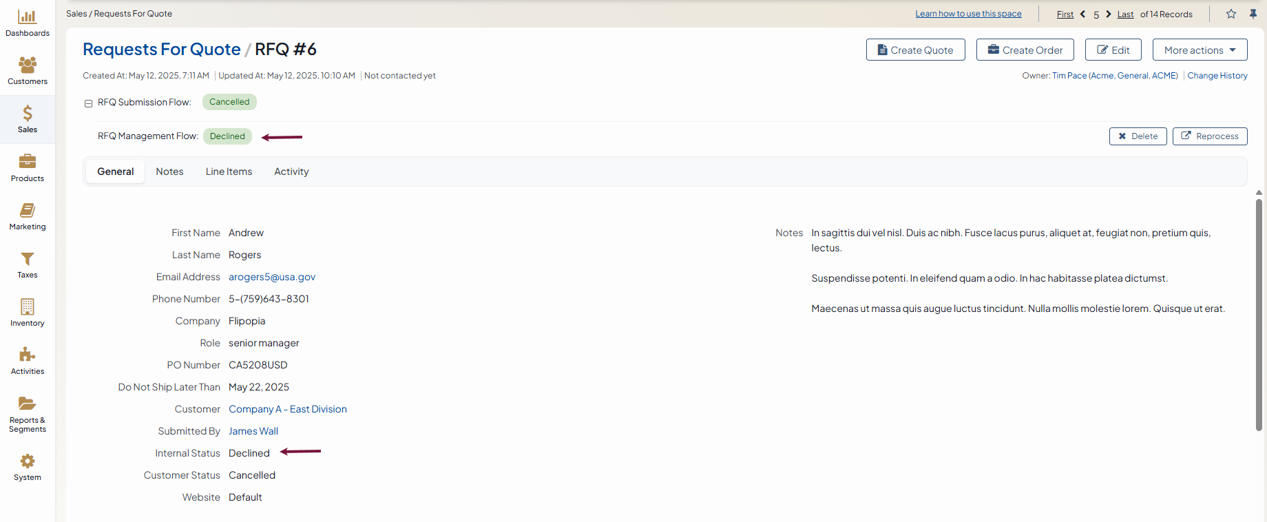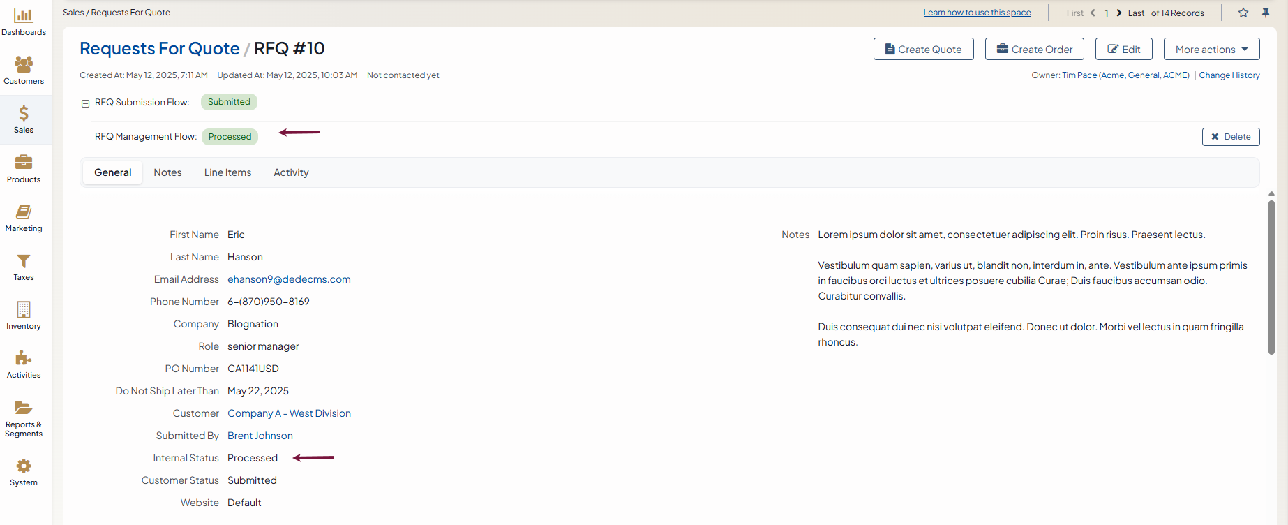 Click Mark as Processed on the RFQ page to mark the RFQ as processed. This will notify the assigned sales representative that the quote is being processed.