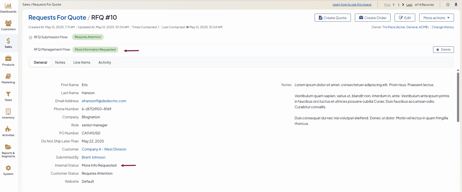 Once the customer responds to the request for additional information, the assigned sales representative is notified that the customer has provided the requested information and can continue processing the request.