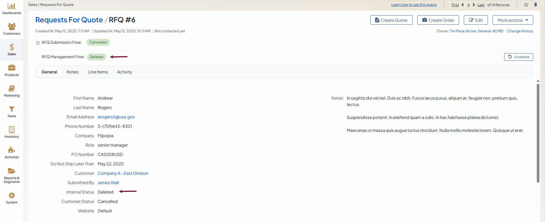 Click Delete on the RFQ page to delete the RFQ from the list.