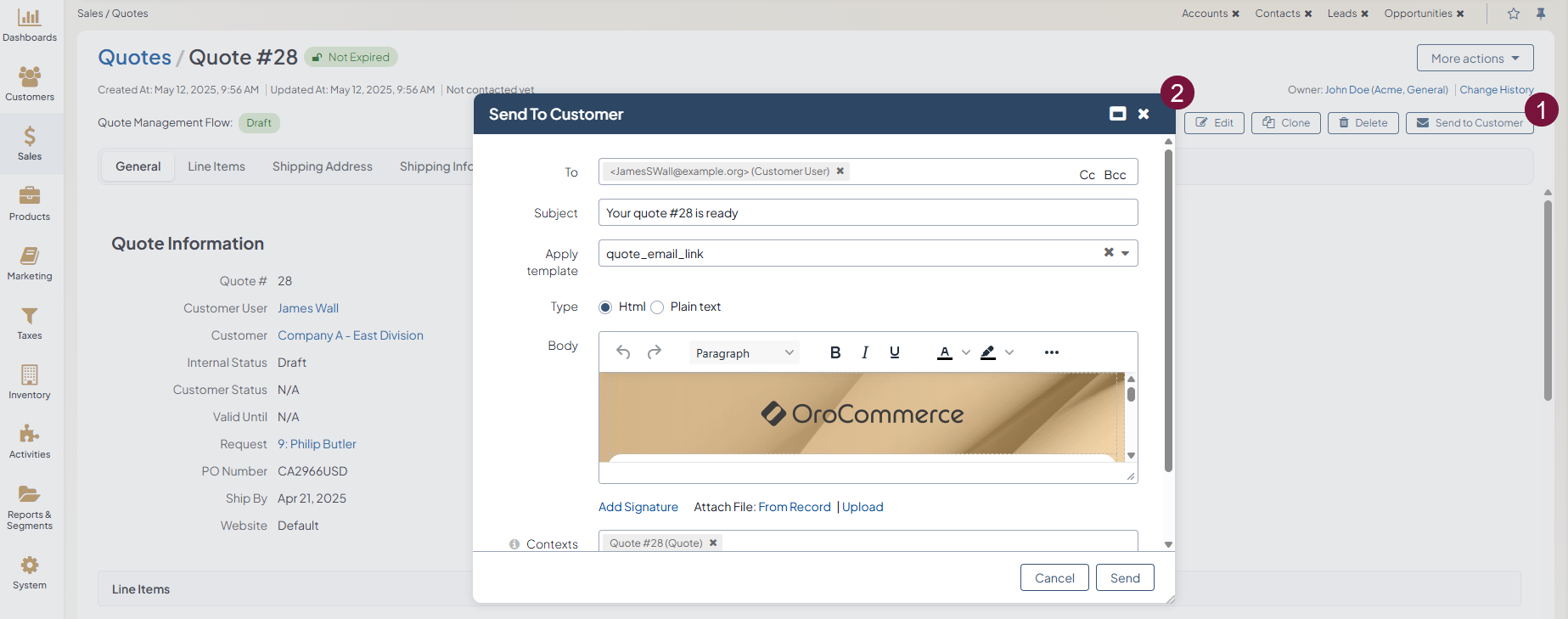 Click Send to Customer to send a notification email message the customer user regarding their quote.