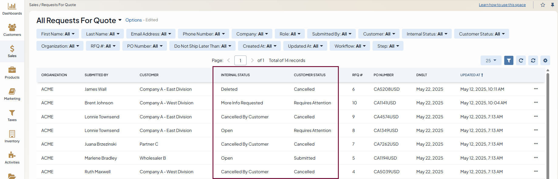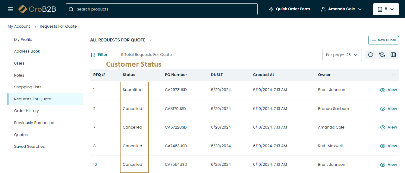 Customer Statuses (correspond to RFQ Submission Flow on the RFQ page) are the statuses displayed to customers in the storefront. In the back-office, they are visible on the RFQ page: