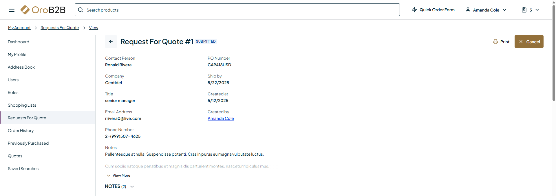 A customer user creates an RFQ in the storefront. Once the RFQ is sent, its customer status is marked as Submitted.