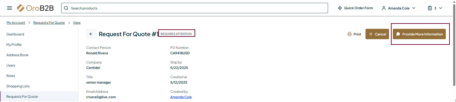 In the back-office, a sales representative sees the RFQ and requests more information. The RFQ is now in the Requires Attention customer status.