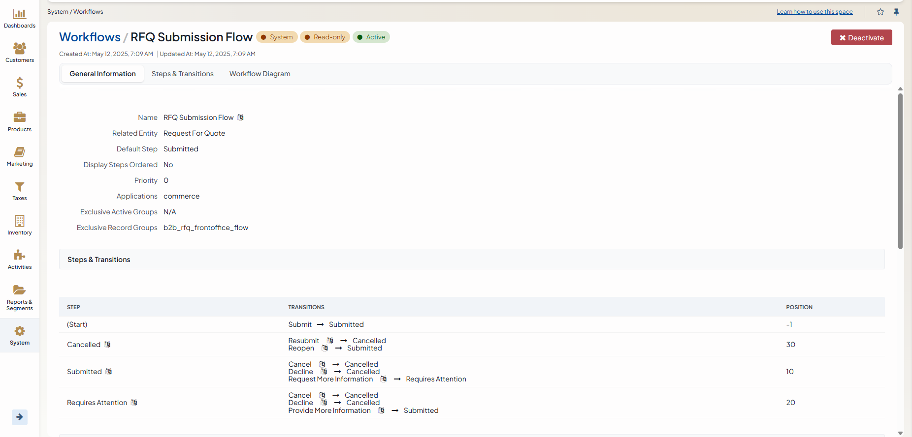 On the RFQ Submission Flow page, you can disable the workflow by clicking Deactivate the workflow.