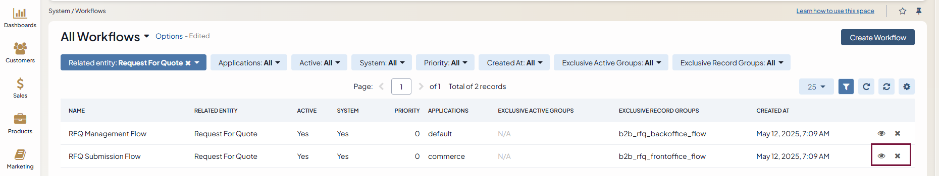 Within the Workflows list, you can perform the following actions for the RFQ Management Flow workflow: