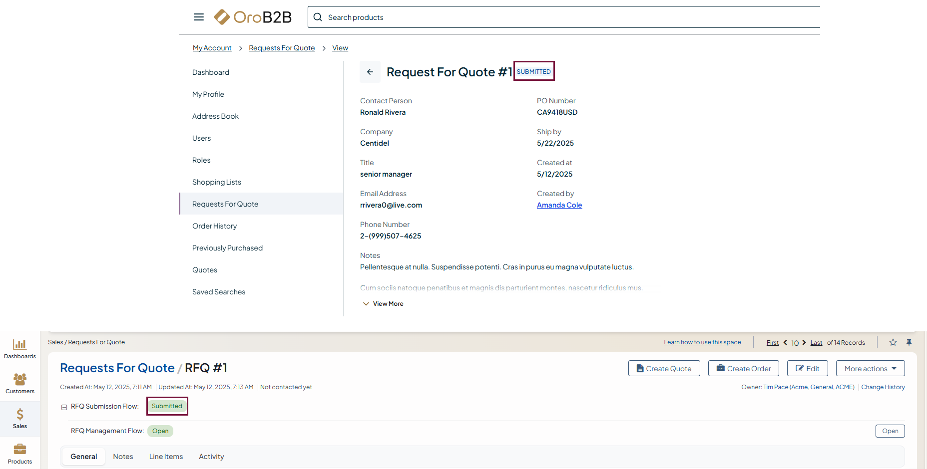 The RFQ management procedure depends on the active RFQ-related workflows. Out of the box, the Oro application supports RFQ Submission Flow and RFQ Management Flow.