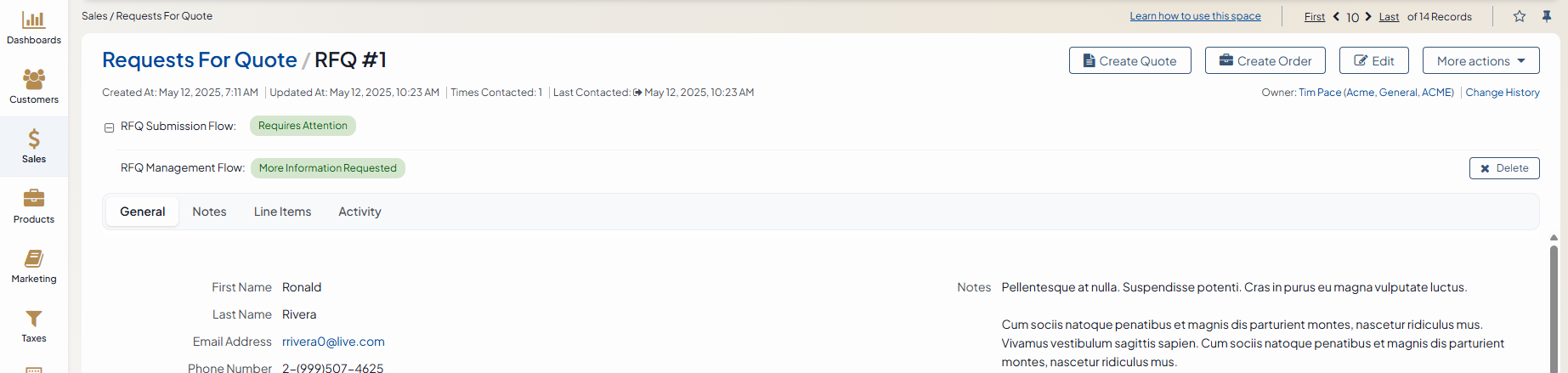 More information has been provided, the sales person marks the RFQ processed and creates a quote straight from the RFQ view page.