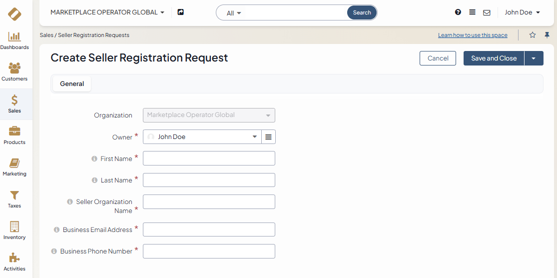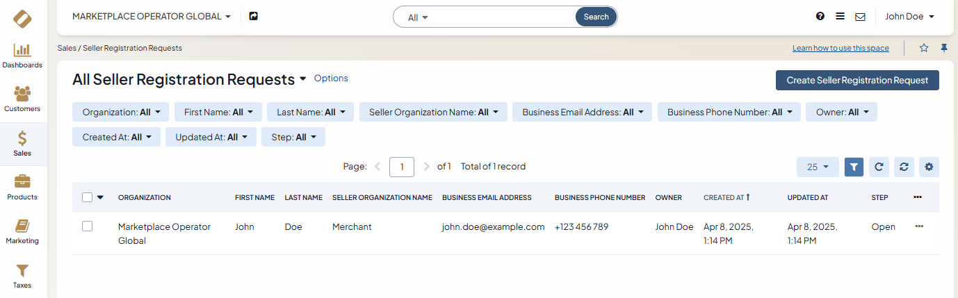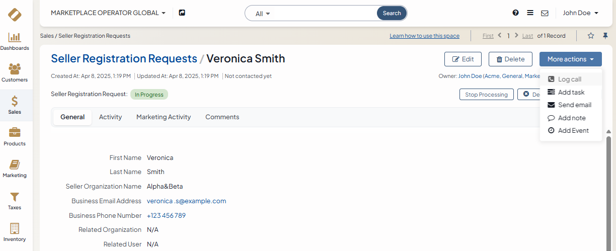 Once the request is saved, the person responsible for handling them can progress it through the steps of the Seller Registration Workflow.