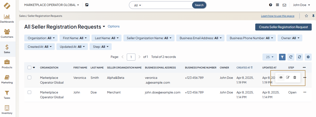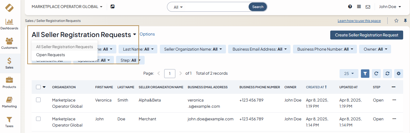 Two grid views are available for seller registration requests: Open Seller Registration Requests and All Seller Registration Requests.