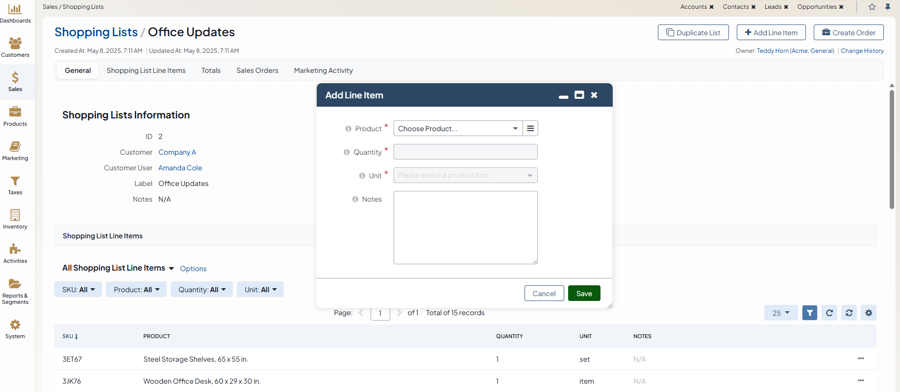 In the Shopping List Line Items section, you can review the details of line items added to the shopping list (products, quantity, unit) and notes to the line items, if any.