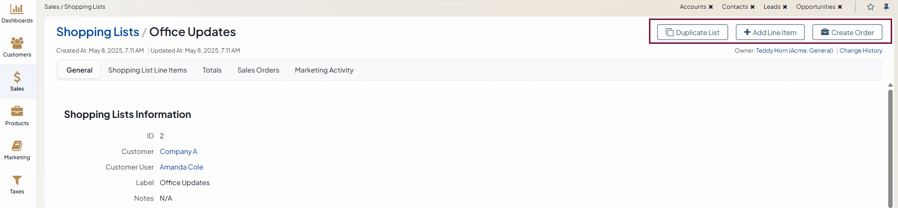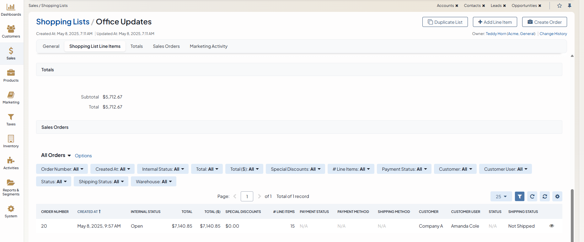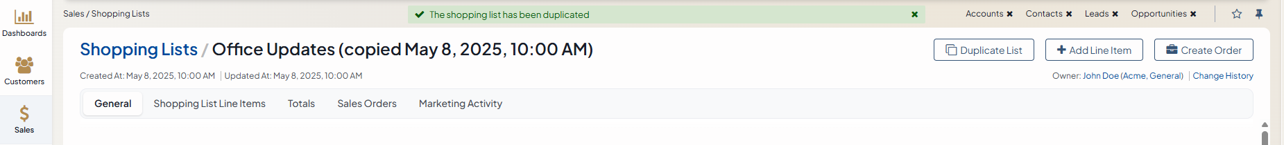 The Sales Orders section displays all orders converted from this shopping list. Click a required order to get redirected to the order details page.