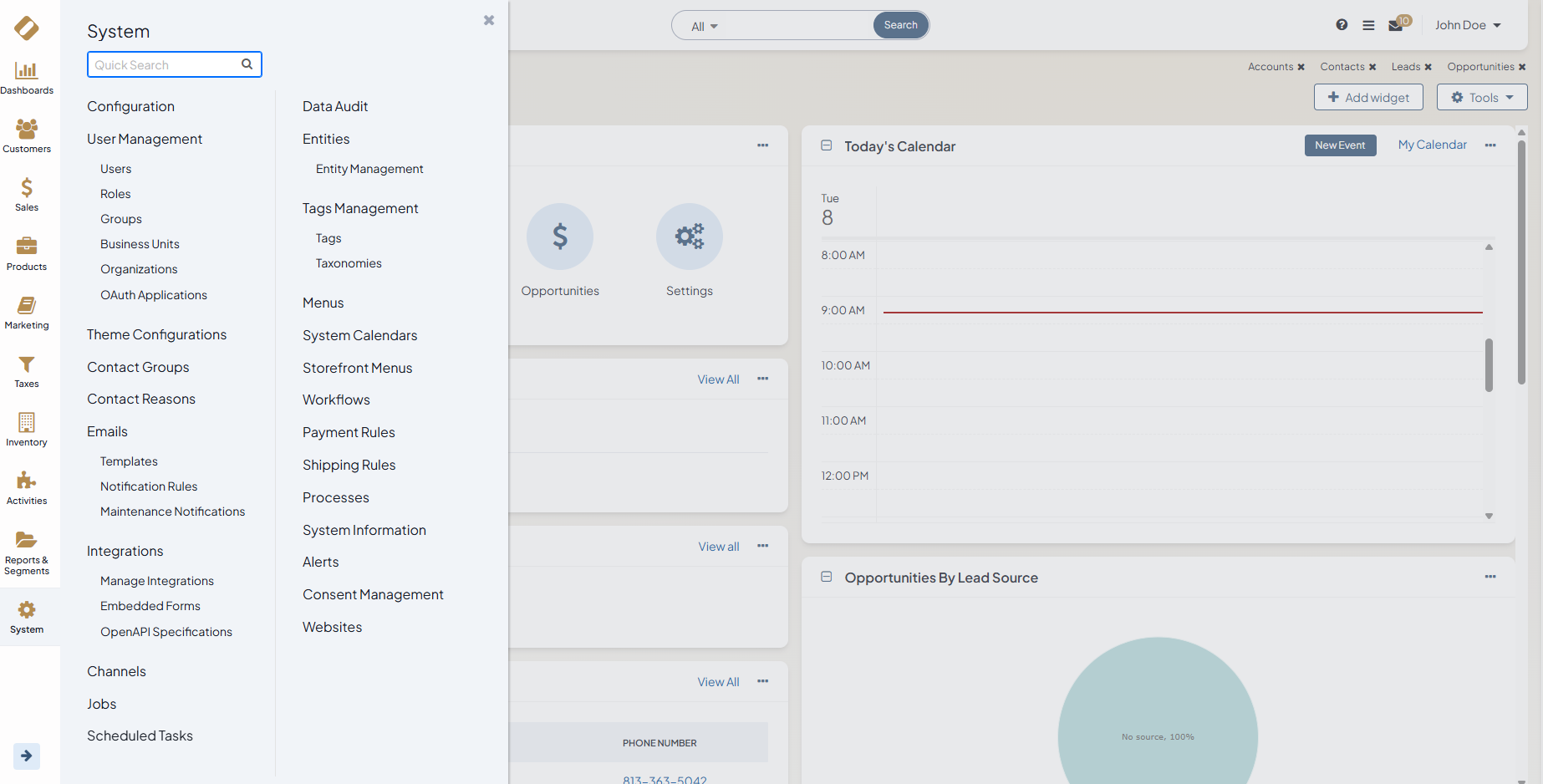 Configuration — Manage system settings and settings specific for CRM, Commerce and marketing features.
