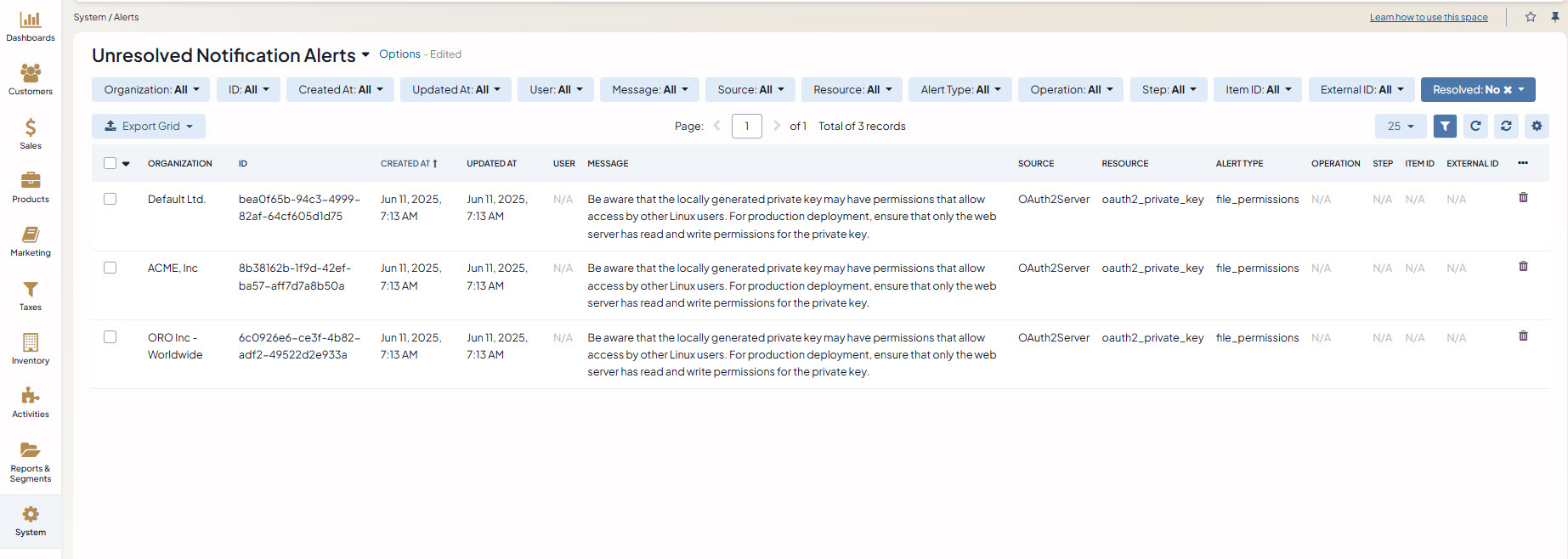You can generate a notification alert to report an error occurred during the application integration. The alerts are stored in the database under the System > Alerts main menu. Developers can either generate the alerts in code or configure them as flash messages to notify a user of any detected errors.