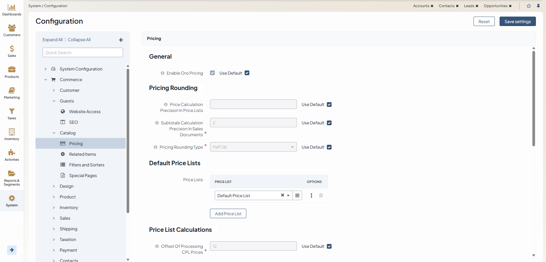 In the General section, enable or disable the default OroCommerce pricing management system.