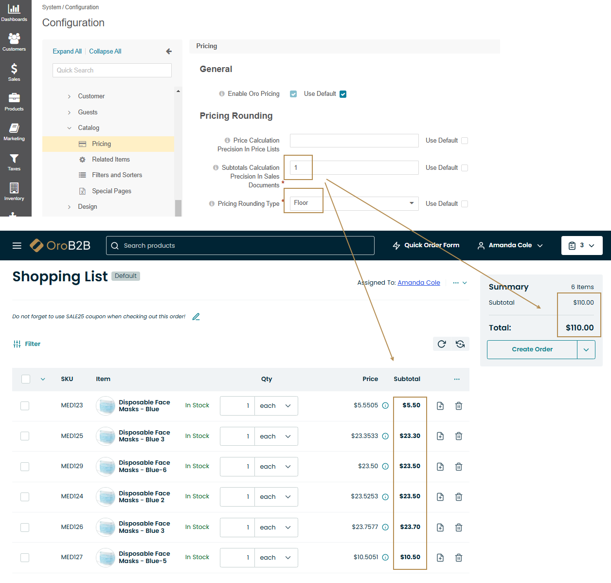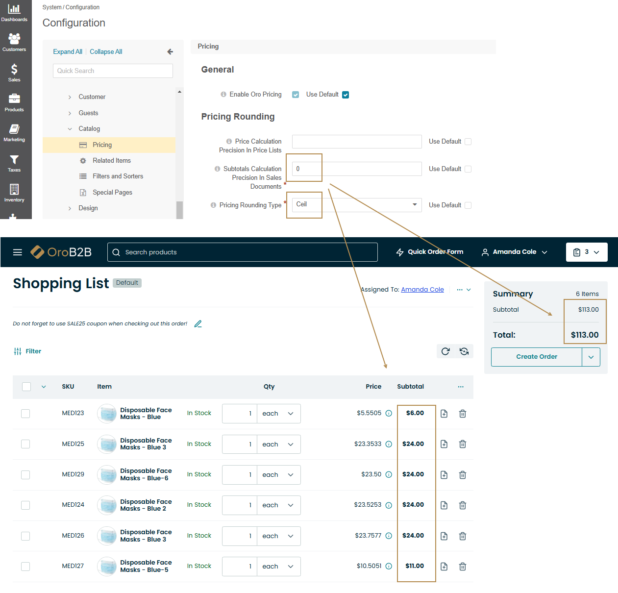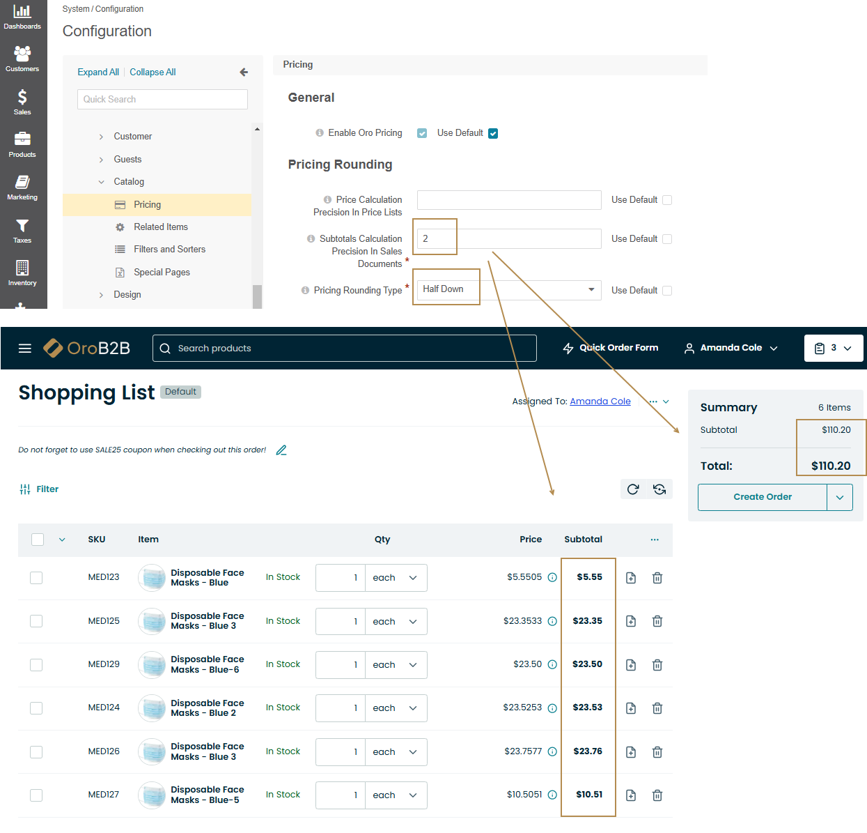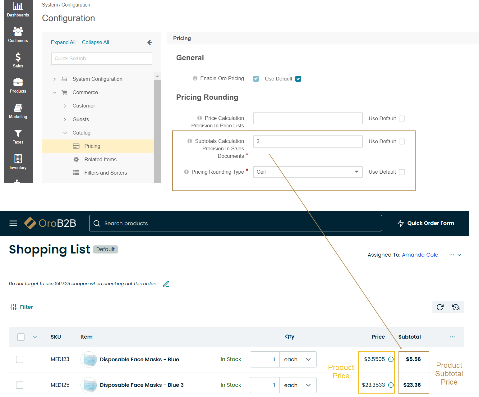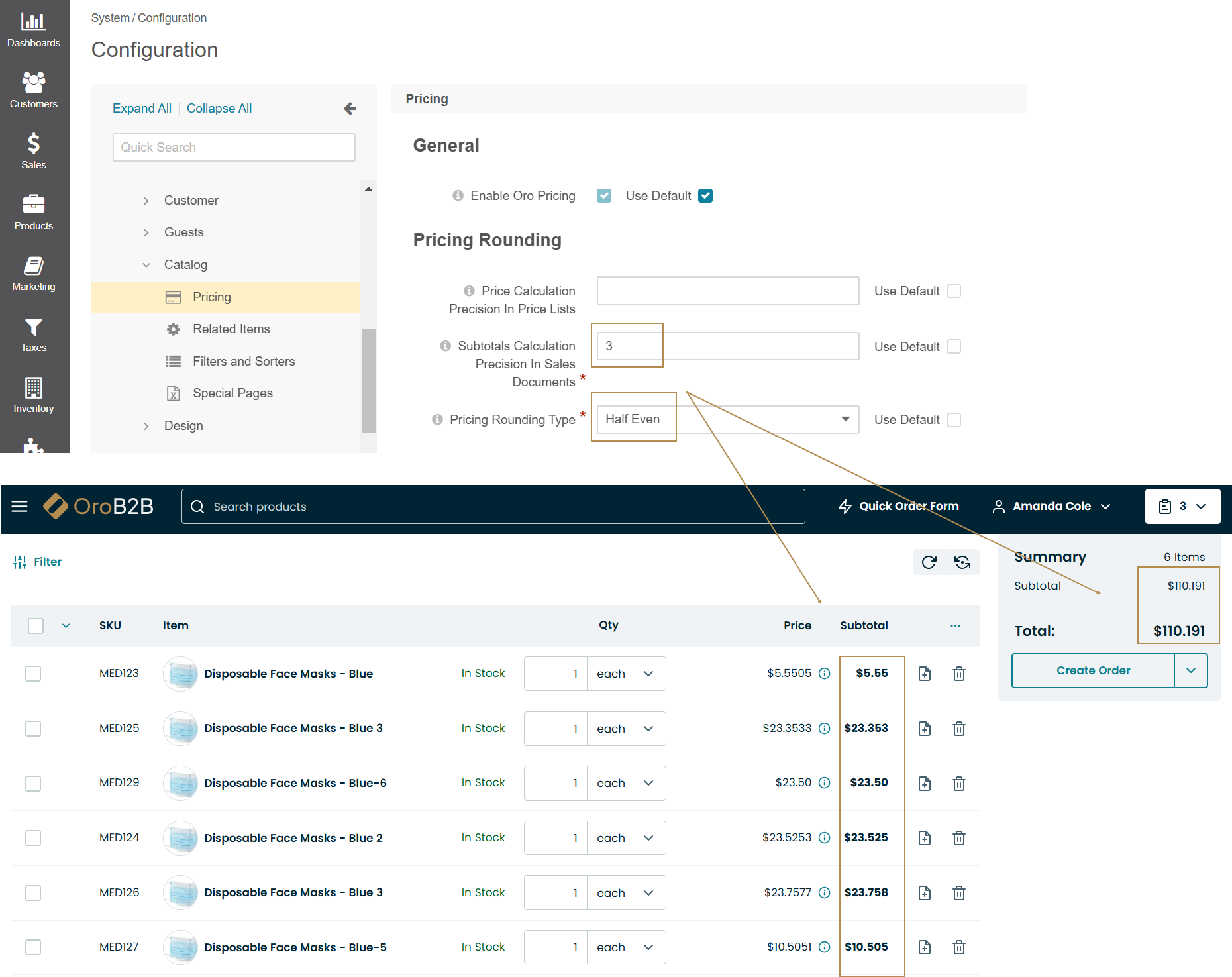 Pricing Rounding Type — The rounding type is used when a calculated product price has more digits in the fractional part than allowed by the respective price precision settings. These are the rounding settings used for price and tax calculations that happen in shopping lists, checkout, orders, and RFQs. Please use one of the following options:
