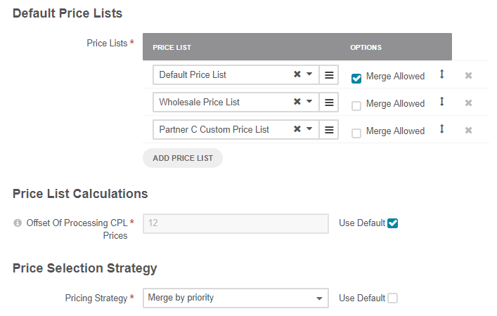 In the Default Price Lists section, configure default price lists, their priority, and merge strategy to get the necessary resulting combination of prices that are shown on the websites:
