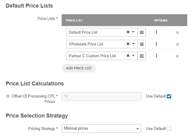 Price Lists — A set of default price lists that can be used for price calculation. A website, a customer group, and a customer can have their own set of price lists that overrides the default configuration. Remember that the customer group configuration overrides the config on the website level, while the customer configuration overrides the one on the customer group level (website < customer group < customer).