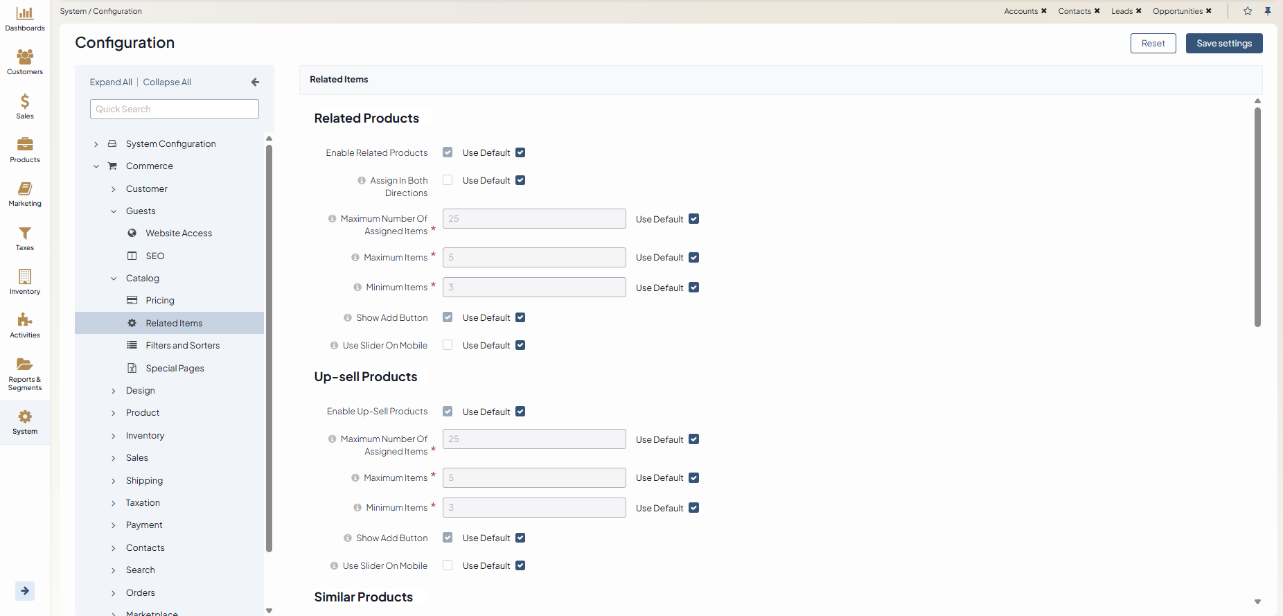 In the Related Items section, you can configure the system settings for related, up-sell, and similar products. These settings may apply globally, per organization, and per website.