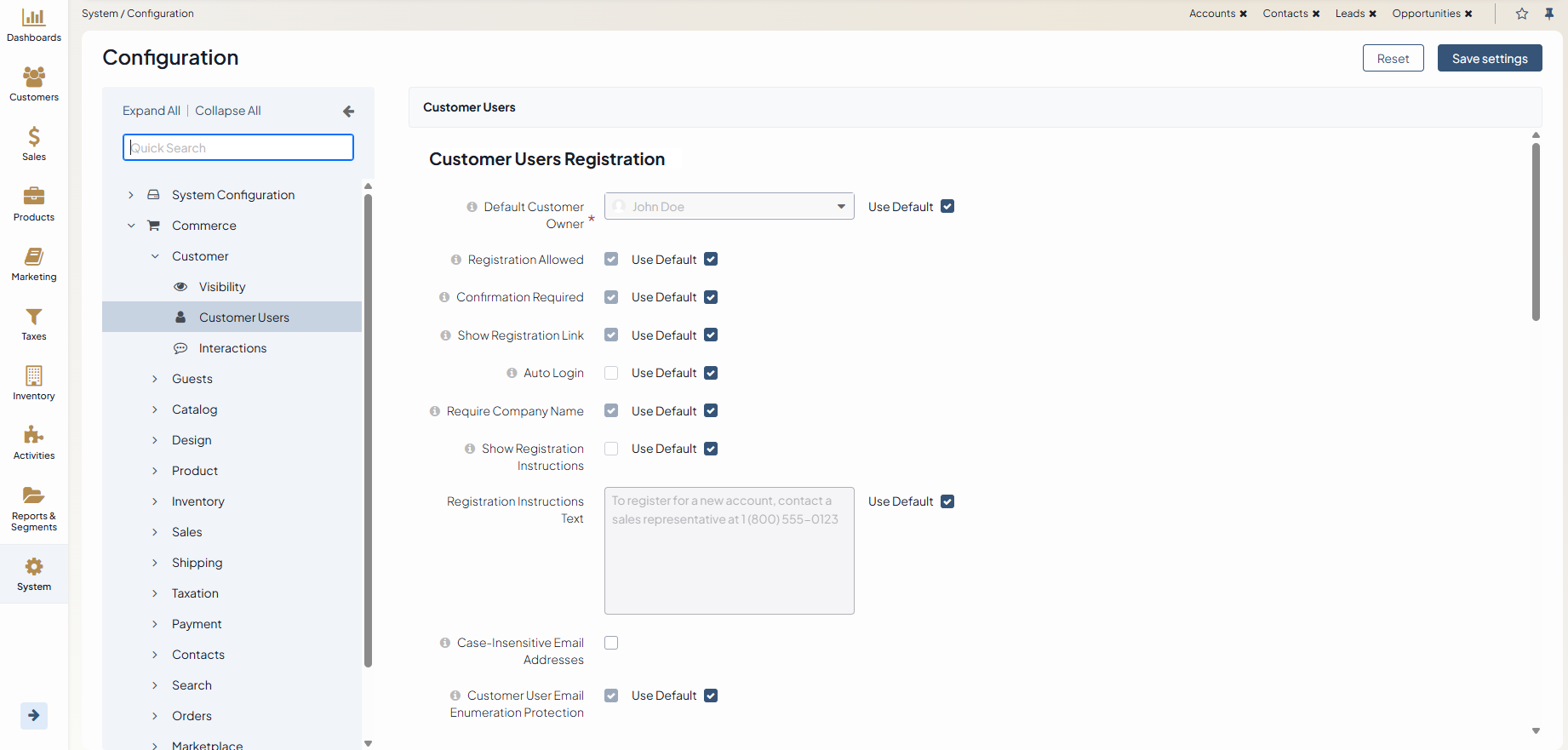 Default Customer Owner — Service information that determines which user has full access to managing and viewing customer information. Usually, this is the default customer administrator or the administrator assigned to the customer. Applies to the customers created in the back-office as well as to those who register on the OroCommerce website.