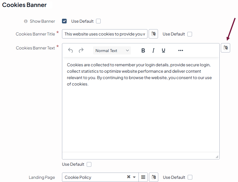Cookies Banner Text — Provide the message of the cookie banner. To edit the text for a specific language, click the language button and edit the text for the needed language.